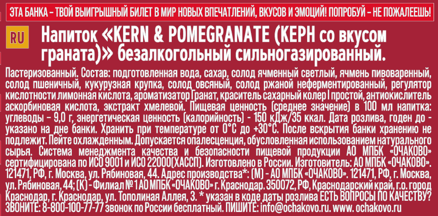 Подготовленная вода, сахар, солод ячменный светлый, ячмень пивоваренный, солод пшеничный, кукурузная крупка, солод овсяный, солод ржаной неферментированный, регулятор кислотности лимонная кислота, ароматизатор гранат, краситель сахарный колер i простой, антиокислитель аскорбиновая кислота, экстракт хмелевой.