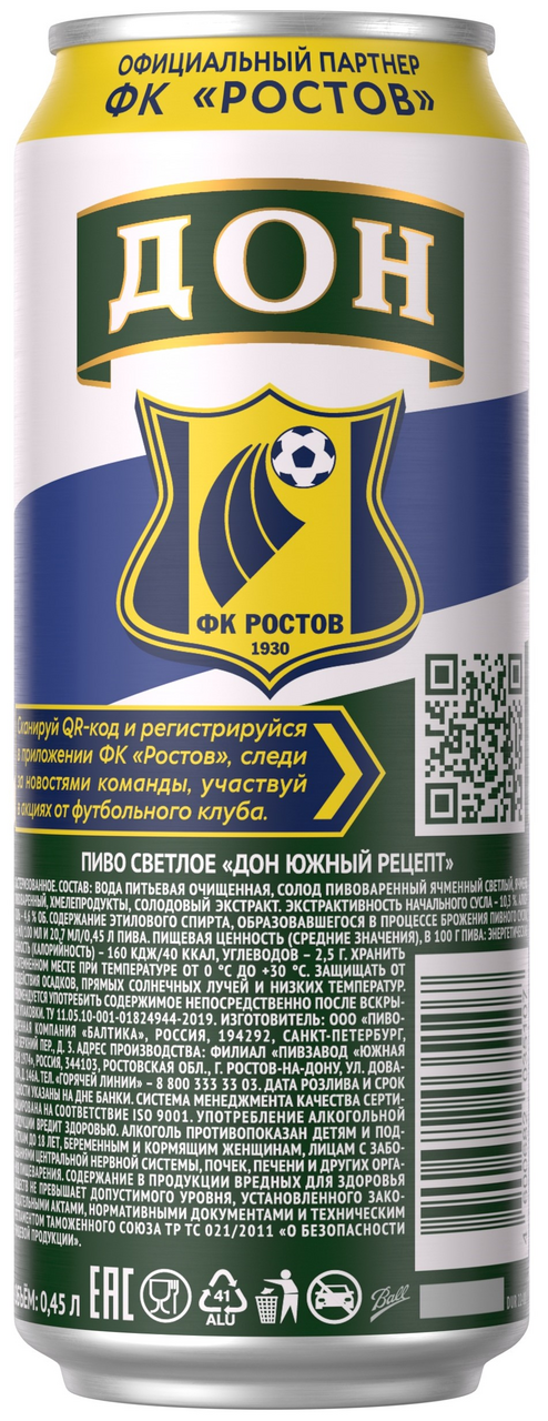 Фирменное южный светлый фильтрованный лагер из натуральных ингредиентов и особого сорта донского ячменя, который за счет богатой плодородной почвы придает напитку яркий солодовый аромат и сбалансированный бархатистый вкус.