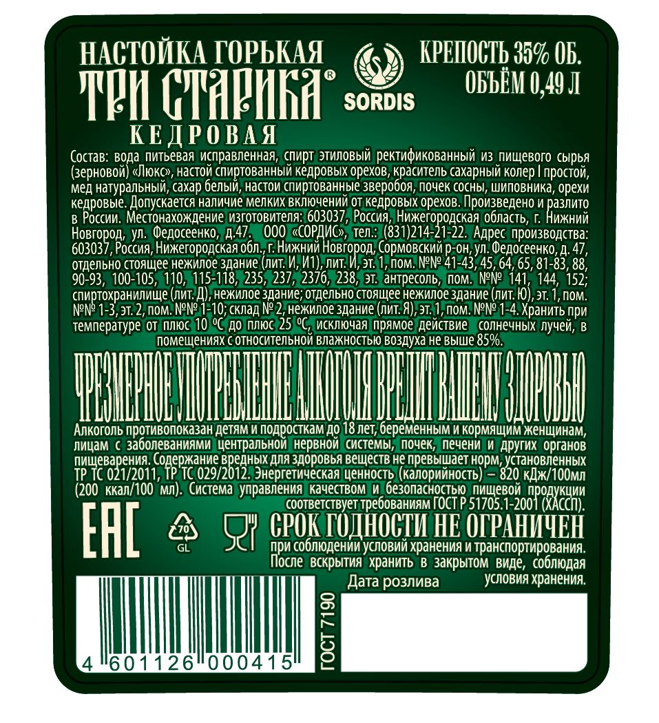 Легендарная горькая настойка, изготовленная по старинным рецептам на современном оборудовании. Предприятие Сордис, на котором выпускается настойка, гордится уникальной рецептурой своего продукта, в который входит зерновой спирт класса "Люкс", специально подготовленная вода, спиртованные настои кедровых орехов, зверобоя, сосновых почек и шиповника, плоды кедровых орехов. Благодаря сахарному колеру настойка приобретает красивый темно-янтарный цвет. Мягкость вкусу придают добавленные в напиток сахарный сироп и натуральный мед. Настойка обладает рядом целебных и лечебных свойств. Употребление в умеренных количествах укрепляет иммунитет. Настойку можно подавать в чистом виде в качестве аперитива или дижестива. При желании ее можно дополнить холодными закусками и мясными блюдами.