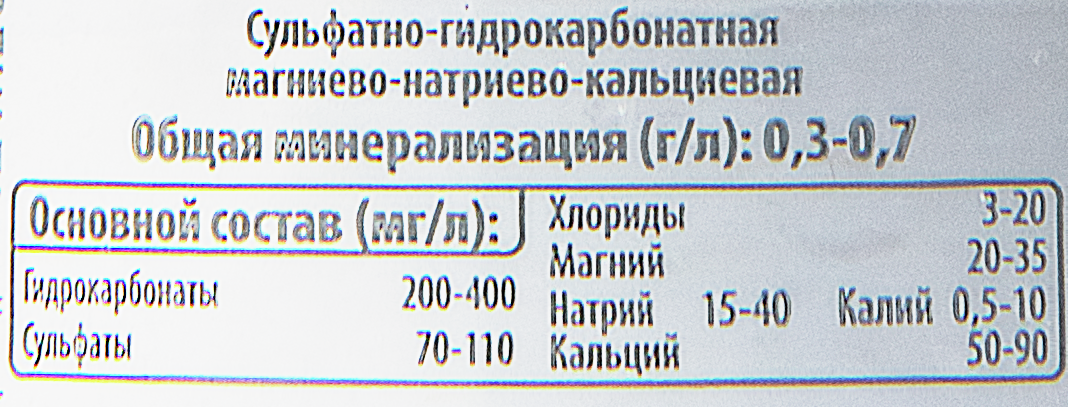 Гидрокарбонаты HCO3-200-400, сульфаты SO42-70-100, сульфаты SO42-70-100, натрий Na+ К+ 20-70, кальций Ca2+ 50-90.