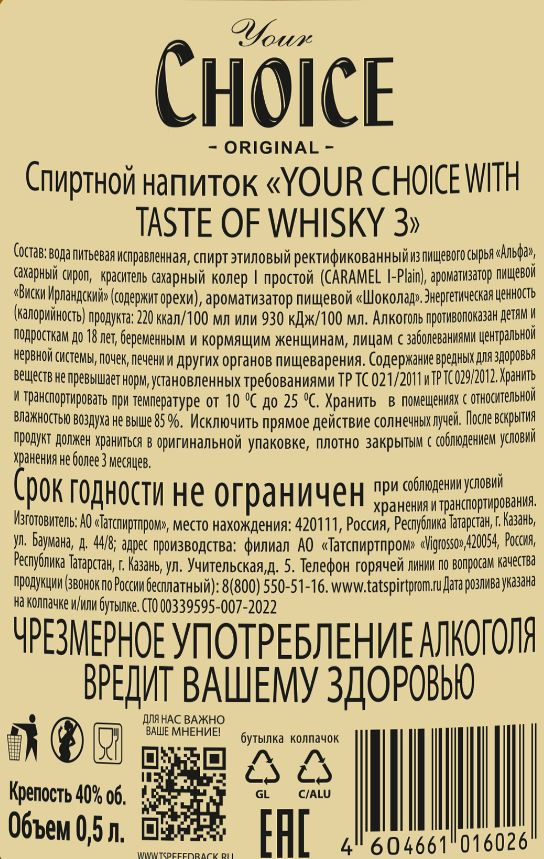 Напиток спиртной With taste of Scotch Whisky 3, 40% Your Choice – это спирт изо ржи, выдержанный в контакте с древесиной французского дуба. Напиток проходит три цикла выдержки. Продукт имеет натуральный состав и изготавливается в соответствии с самыми высокими стандартами качества. Ответственность компании за качество конечного продукта подтверждается индивидуальным порядковым номером, который присваивается каждой бутылке.
