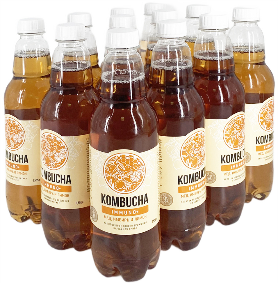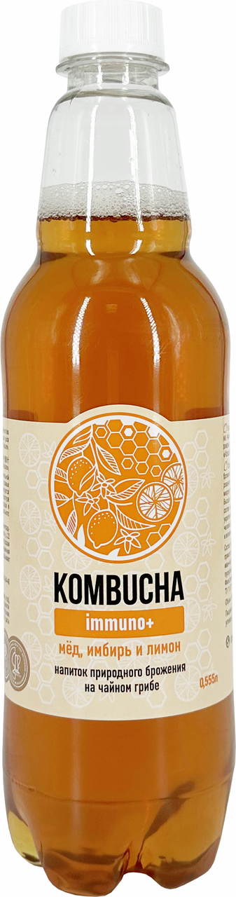 Безалкогольный напиток натурального брожения на чайном грибе с имбирем, медом и соком плодов лимона Kombucha — Immuno+. Освежающий, тонизирующий, ферментированный напиток на основе чая и иван-чая, с добавлением настоя имбиря, натурального мёда и сока плодов лимона.