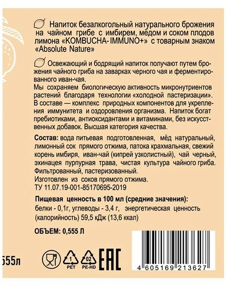 Напиток на чайном грибе Комбуча Absolute Nature Immuno+ с имбирем, медом и соком плодов лимона, 555мл
