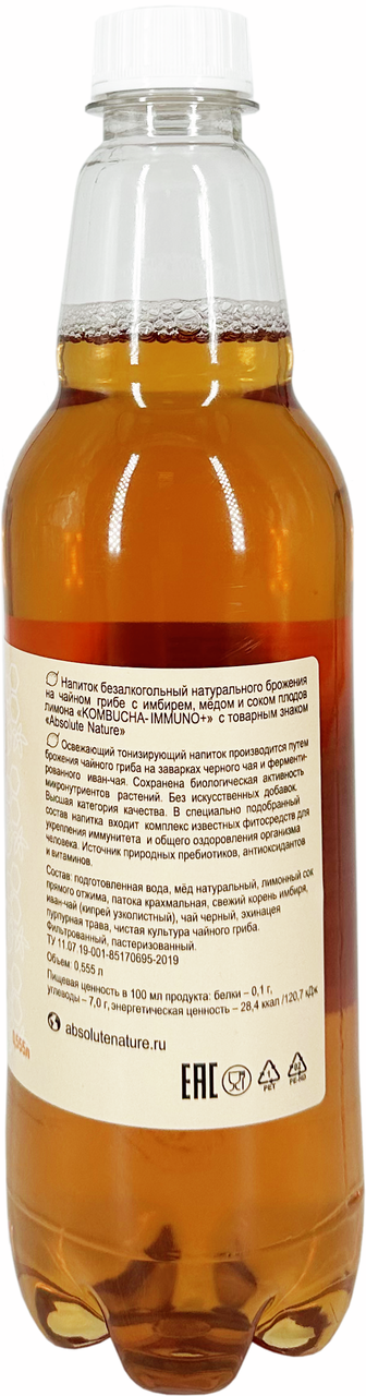 Безалкогольный напиток натурального брожения на чайном грибе с имбирем, медом и соком плодов лимона Kombucha — Immuno+. Освежающий, тонизирующий, ферментированный напиток на основе чая и иван-чая, с добавлением настоя имбиря, натурального мёда и сока плодов лимона.