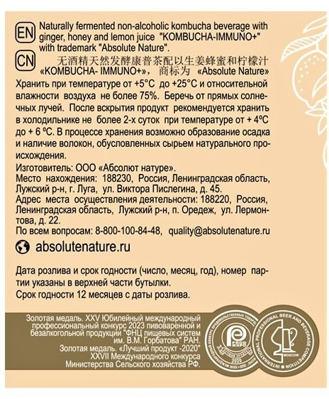 Напиток на чайном грибе Комбуча Absolute Nature Immuno+ с имбирем, медом и соком плодов лимона, 555мл х 12 шт