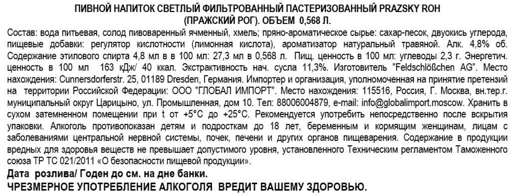 Напиток пивной Prazsky Roh светлый, 0.568л