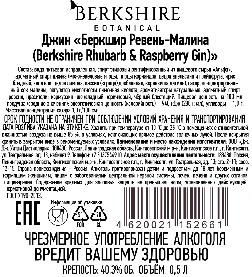 Вода питьевая исправленная, спирт этиловый ректификованный из пищевого сырья альфа, ароматный спирт джина (можжевеловые ягоды, плоды кориандра, цедра апельсина и грейпфрута, ирис бледный, хвоя ели, цедра лимона, кассия (корица) дробленная, корневища дягиля), сахар, концентрированный сок малины, регулятор кислотности лимонная кислота, ароматизаторы натуральные, ароматный спирт ревеня, красители: кармуазин, шоколадный коричневый, чёрный блестящий.