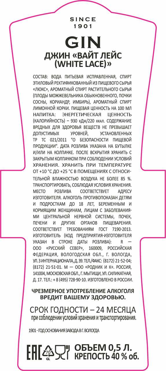 Джин White Lace приготовлен по классической английской технологии. В состав джина White Lace входят исключительно натуральные ингредиенты: кристально чистая вода, зерновой спирт Люкс, ароматный спирт можжевельника, почек сосны, кориандра и имбиря, ароматный спирт лимонной корки. Основным компонентом, который формирует характерный вкус и аромат напитка является ароматный спирт можжевельника, получаемый методом перегонки (дистилляции). Ароматный спирт лимонной корки придает напитку свежую цитрусовую нотку и приятное послевкусие.