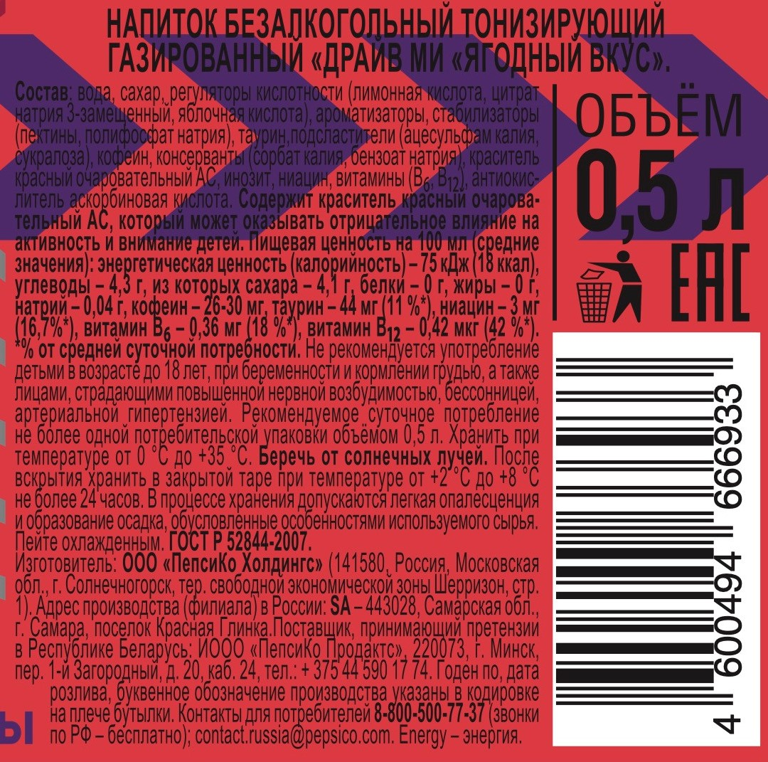 Drive Me - это бренд для тех, кто всегда на драйве. Драйв - это то, что внутри тебя, где у других все выходит из-под контроля и трясутся поджилки, ты чувствуешь прилив сил и энергии. Ничто не сможет тебя остановить. Безалкогольный тонизирующий газированный энергетический напиток с бодрящим, освежающим вкусом, наполненным яркими нотами спелых, сочных ягод. Напиток, изготовленный по уникальной рецептуре с добавлением кофеина, таурина и витаминов группы В, не только утолит жажду, но и подарит быстрый заряд сил и дополнительную энергию в течение дня. В небольших дозировках кофеин и таурин не вредны и даже полезны для организма человека, они способны уменьшить чувство усталости и сонливости, стимулировать умственную активность и улучшить концентрацию внимания.
