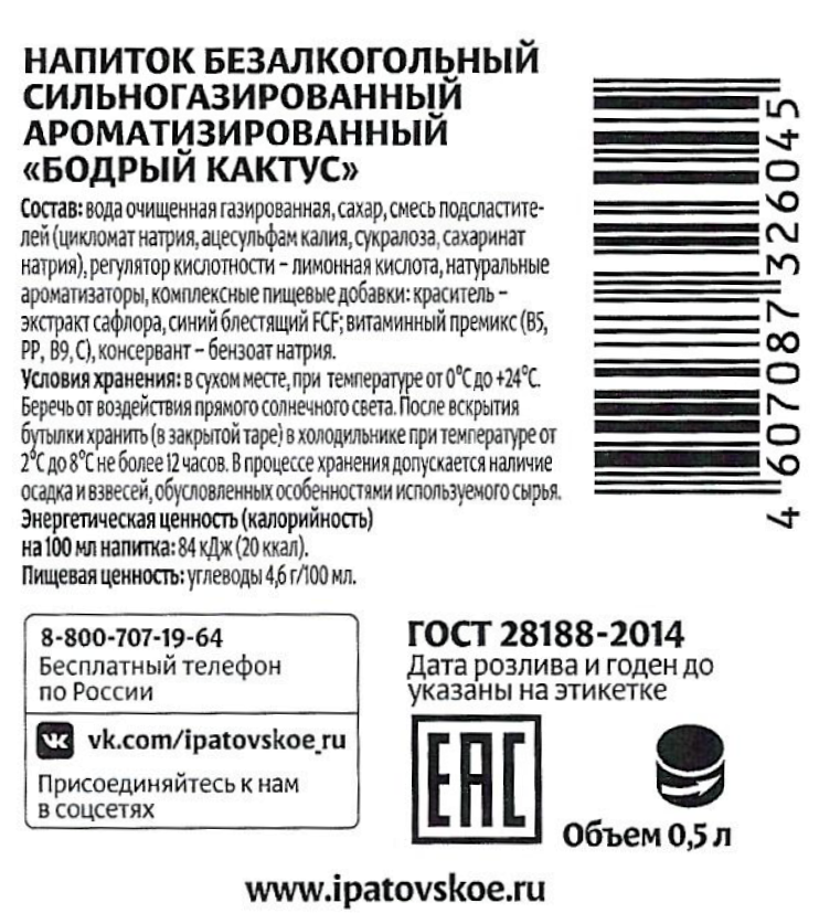 Напиток Ипатово Бодрый кактус газированный, 500мл x 12 шт - вкус детства, сбалансированный состав, который можно проверить при выборе продукта, высокая степень очистки, приятный вкус. Газированный напиток, лимонад. Изготавливается по старинным традициям из натуральных компонентов. Напиток имеет незабываемый вкус, знакомый не одному поколению. Новый вкус лета сочетает в себе больше натуральных ингредиентов и содержит меньше калорий.