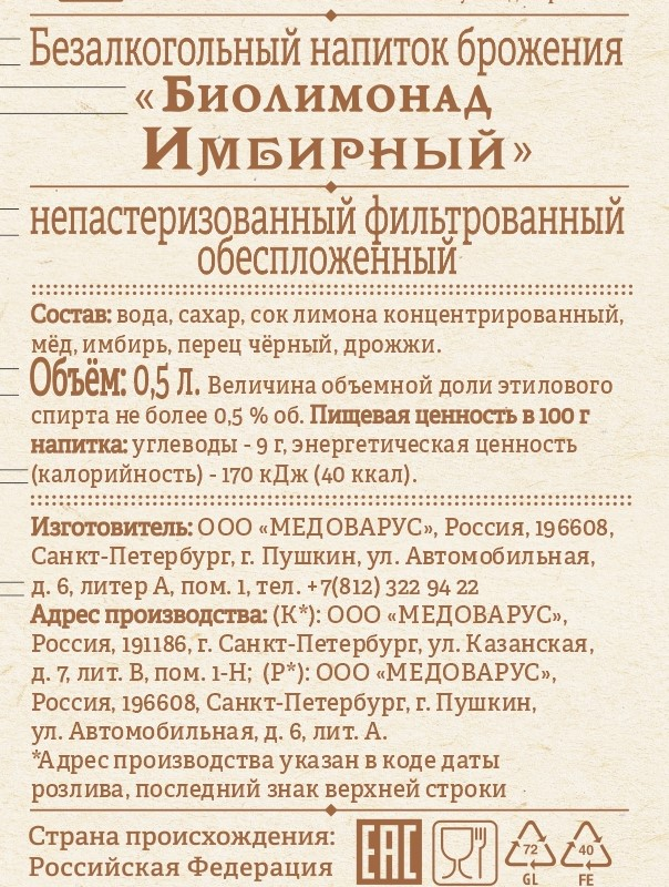 Вода, сахар, сок лимона концентрированный, мёд, имбирь, перец черный, дрожжи.