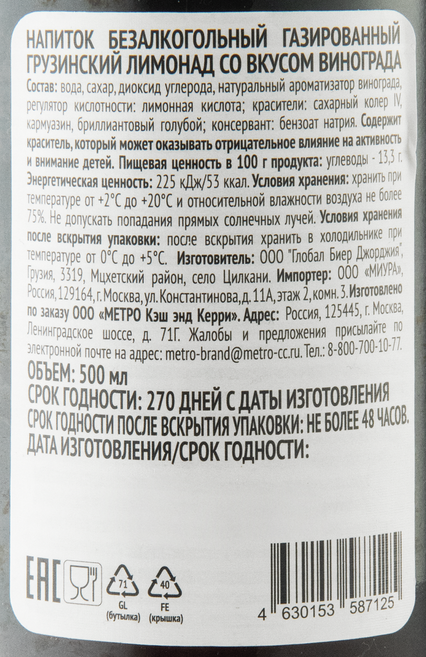 Сделан на основе чистейшей воды из горных источников и сока красного винограда. Обладает выраженной вкусовой композицией, насыщенным ягодным ароматом и благородным темно-бордовым цветом. Благодаря стеклянной бутылке у лимонада хорошо сохраняются все органолептические свойства на протяжении срока его хранения. Напиток великолепно освежает и станет прекрасным дополнением вашего стола к��к в праздники, так и в будни.