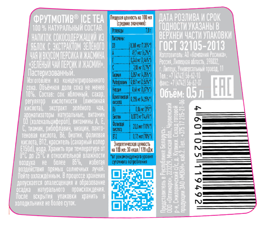 Сок яблочный, сахар, регулятор кислотности лимонная кислота, экстракт зеленого чая, ароматизаторы натуральные, витамин D D3 холекальциферол, витамины А, Е, С, тиамин, рибофлавин, ниацин, пантотеновая кислота, В6, биотин, фолиевая кислота, В12, краситель сахарный колер Е150d, вода.