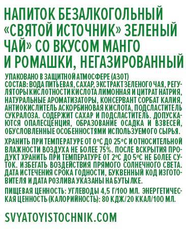 Холодный чай Святой Источник - это природный чай на основе чистой негазированной воды с нежным вкусом спелого Манго и нотками ромашки. Источник радостных открытий в течение дня. Чистая вода и природные экстракты чая помогут освежиться в любой момент, а оригинальные сочетания сбалансированных вкусов привнесут разнообразие в привычный рацион.