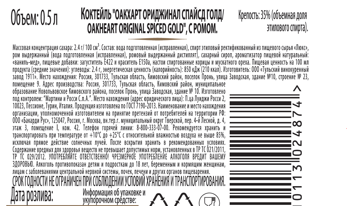 Коктейль ромовый OakHeart Original Spice Gold, 0.5л