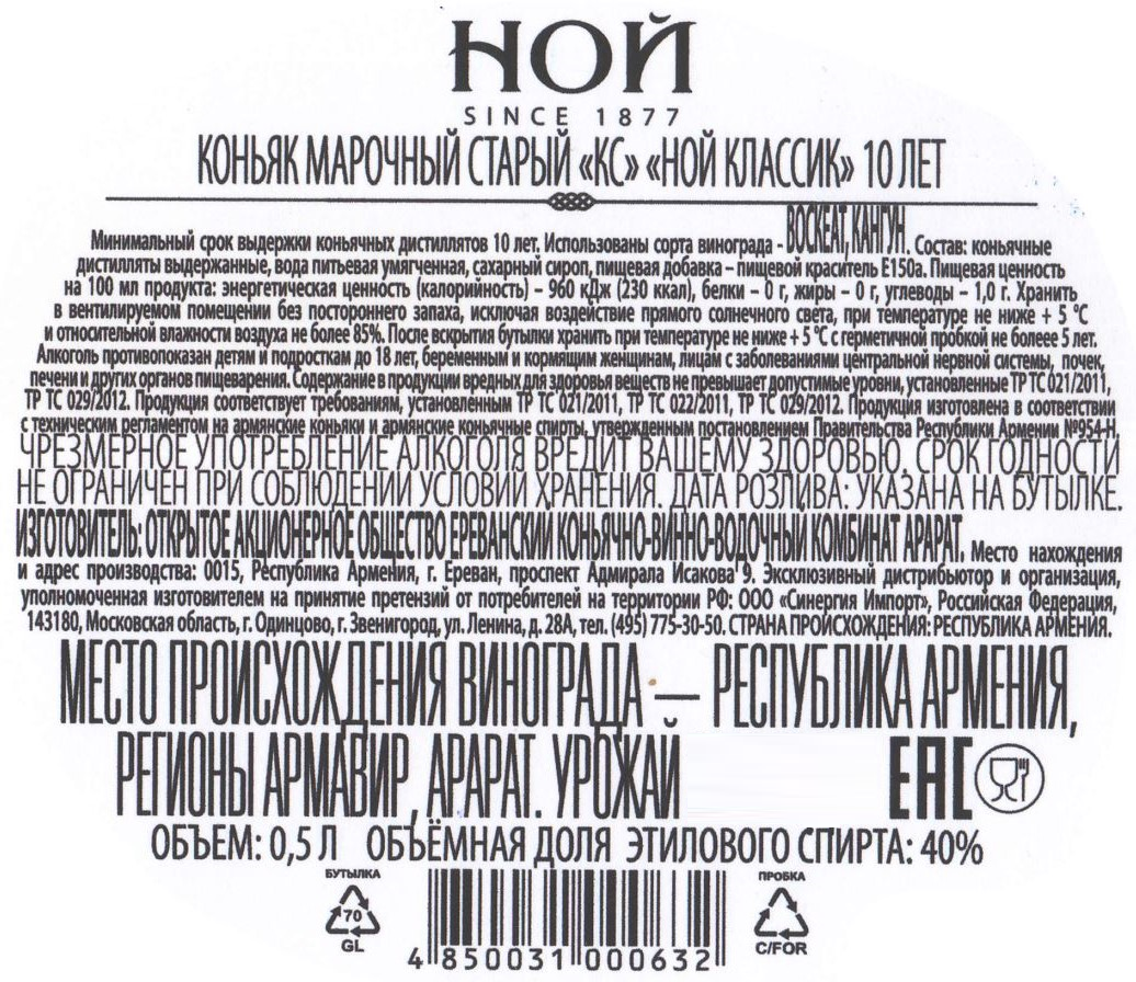 Один из лучших в своей категории. Он назван в честь классической архитектуры Эриваньской Крепости XVI века, которая была восстановлена архитектором Рафаелом Исраеляном. Коньяк производится из региональных сортов винограда — Воскеат, Мсхали, Гарандмак, выращенного в Араратской долине. При изготовлении коньяка используется двойная дистилляция по шарантскому методу, затем напиток выдерживается как минимум 10 лет в дубовых бочках. Купаж данного коньяка содержит высокий процент старых коньяков, поэтому он имеет более насыщенный аромат, чем другие коньяки этой категории. Ной Классик разливается в кристально чистую оригинальную бутылку Helios, которая идеально подчеркивает качество этого изысканного коньяка.