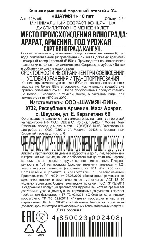 В сердце Араратской долины расположились виноградники и современное производство дистиллерии Шаумян Вин - хранителя традиций армянского коньячного искусства.История хозяйства началась в 1886 году. С тех пор здесь создают коньяки по классической французской технологии: двойная дистилляция в медных аламбиках, выдержка в дубовых бочках и тщательный купаж, которым занимаются мастера с многолетним опытом. Их профессиональное чутьё и знание тонкостей процесса - залог неповторимого характера каждого напитка.Шаумян Вин владеет собственными виноградниками общей площадью 250 гектаров. Многие лозы насчитывают несколько десятилетий - их возраст свидетельствует о преемственности традиций и стабильном качестве сырья. Виноград выращивается на высоте около 1000 метров над уровнем моря. Вулканические почвы Араратской долины -уникального терруара, признанного визитной карточкой легендарного армянского бренди - придают дистилляту особую лёгкость и деликатность вкуса, отличающую его от продуктов других регионов.Шаумян Вин контролирует весь производственный цикл - выращивание винограда на собственных плантациях, получение дистиллятов (завод производит собственные спирты), выдержка в специально оборудованных погребах, расположенных в Араратской долине, финальный купаж и розлив.Полный контроль на каждом этапе позволяет гарантировать высочайшее качество продукции. Это подтверждается более чем 30 международными наградами, полученными заводом.В основе философии Шаумян Вин - гармоничное слияние современных технологий с вековыми традициями армянского коньячного производства при неизменном сохранении уникальности терруара и мастерства виноделов.Коньяк прекрасного янтарного цвета с мягким медным отблеском - результат применения французской методики, которая на протяжении десятилетий доказывает свою эффективность в раскрытии исключительной глубины и благородства напитка. Двойная перегонка в медных аламбиках сохраняет деликатные ароматические компоненты, которые со временем трансформируются в сложные бальзамические тона. Десятилетняя выдержка в дубовых бочках формирует насыщенную текстуру и многогранный букет: появляются ноты пчелиного воска, сухофруктов (преимущественно чернослива) и лёгкой ванили. Постоянный контроль условий созревания обеспечивает плавное взаимодействие спирта с древесиной, создавая длительное, гармоничное послевкусие с оттенками сладости и пряности. Во вкусе ощущаются глубокие древесно дубовые тона, обогащённые шоколадно карамельными оттенками и нюансами воска. Аромат сложный, с фруктово пряными нотами.Подаётся при температуре 18-20С. Оптимальный способ подачи - в чистом виде, чтобы полностью раскрыть сложный букет. Допустимо подавать с кубиками льда либо в сочетании с охлаждённым тоником, долькой лимона для более лёгких вариантов. Сочетается с сырокопчёной колбасой, сырами, горьким шоколадом, свежими фруктами, запечённым мясом с ароматным чёрным перцем. Подходит для пропитки коржей в домашней выпечке - придаёт насыщенный аромат и лёгкую карамельную ноту. Пьётся медленными глотками с задержкой во рту на 4-5 секунд, чтобы поэтапно раскрыть все слои аромата и вкуса: от первых древесно шоколадных нот до долгого финала с оттенками воска и сухофруктов.