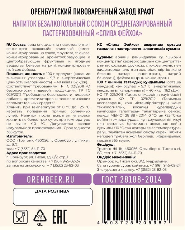 Вода специально подготовленная, концентрат соковый сливовый (смесь концентрированных соков, фруктоза, глюкоза, концентрированные ароматообразующие и цветообразующие фруктовые и ягодные вещества, бензоат натрия), концентрированный сок фейхоа.