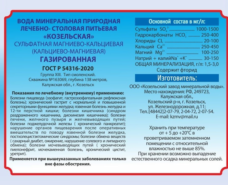 Вода минеральная природная лечебно-столовая питьевая Козельская сульфатная магниево-кальциевая, газированная.