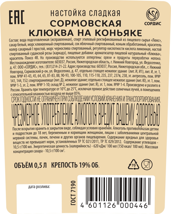 Настойка Сормовская сладкая клюква на коньяке, 0.5л