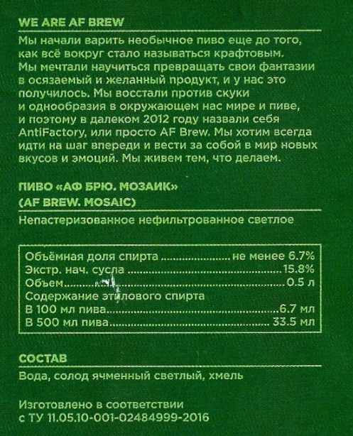 Светлый эль, сваренный в стиле American IPA. Впервые он был представлен пивоварней АФ Брю в начале 2013 года и очень понравился потребителям, поэтому AF Brew перевыпустила Мозаик в августе того же года, немного подкорректировав и усовершенствовав рецептуру. С тех пор пиво стало регулярным сортом пивоварни. Для варки и сухого охмеления был использован хмель HBC 369, коммерческое название которого — Мозаик. Первый урожай это сорта хмеля был собран в США на плантациях компании Yakima Chief в штате Вашингтон в 2012 году. Mosaic IPA от AF Brew — это первое пиво в России, сваренное с хмелем Мозаик.