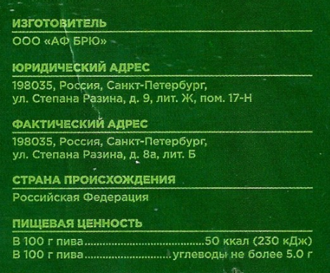 Вода подготовленная, солод пивоваренный ячменный, хмель гранулированный, дрожжи пивные.