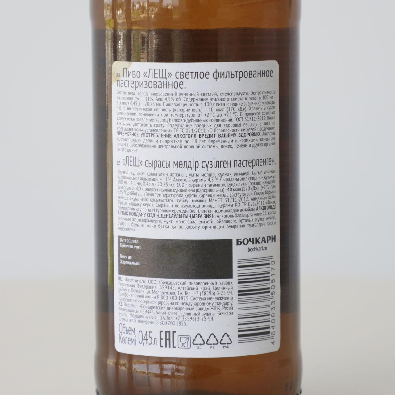 Без консервантов и без пастеризации. Сваренное только из натуральных компонентов. В рецепте только вода, солод, хмель и дрожжи. Изготовление пива Лещ включает 5 традиционных этапов. Сам процесс занимает несколько недель, чтобы в итоге получить достойное выдержанное пиво. Варка пивного сусла длится около 10 часов, затем сусло охлаждается, и в дело вступают пивные дрожжи. Главное брожение продолжается около недели. За ним следует дображивание в течение нескольких недель, набирая глубину и полноту вкуса. Прежде чем попасть в бутылки пиво фильтруется, приобретая непревзойденную прозрачность красивого золотистого цвета, полученного благодаря добавлению в рецептуру карамельного солода.