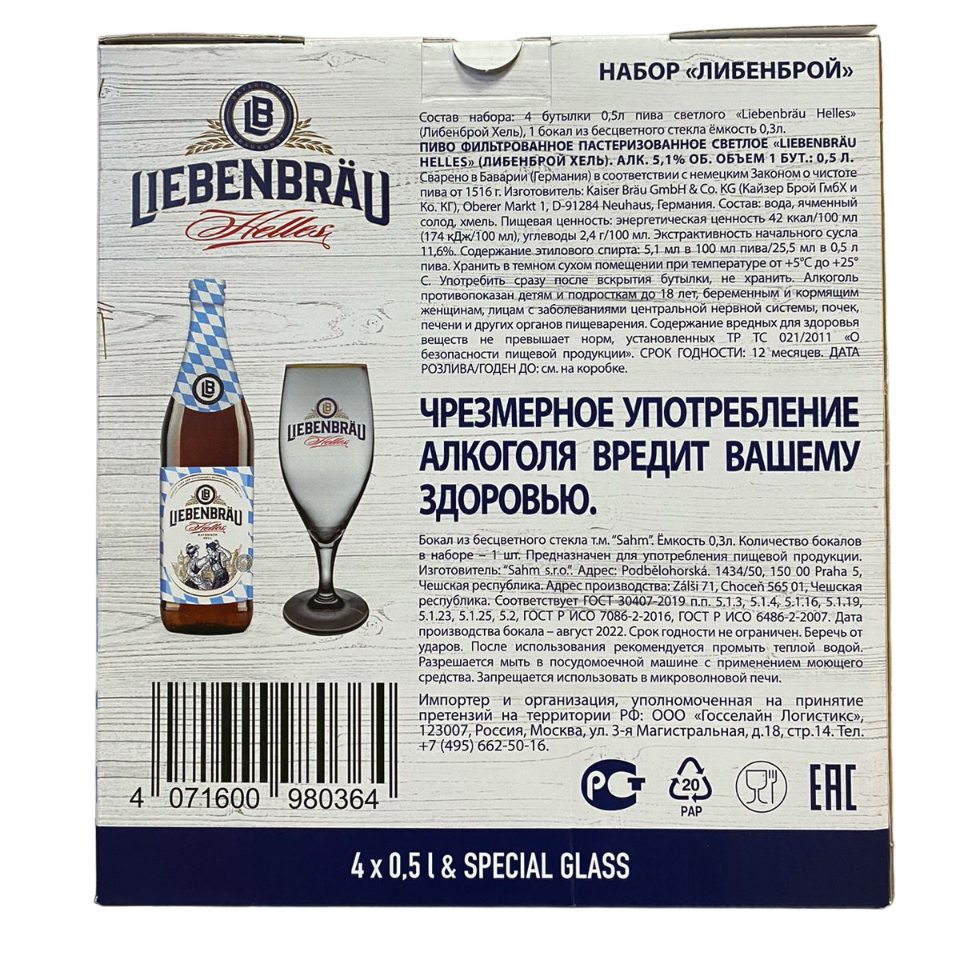 Промо-набор Пиво Liebenbrau Helles светлое + бокал, 0.5л x 4 шт