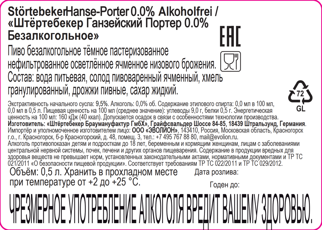Пиво Srortebeker ганзейский портер безалкогольное, 0.5л х 20 шт