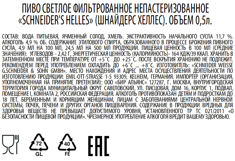 Пиво светлое фильтрованное Schneiders Bayerisch Hell, 0.5л порадует своим вкусом любителей классических вкусов с выраженной горчинкой. Баварские сорта можно назвать эталоном пивоварения, а мастеров – отличными специалистами, соблюдающими древние традиции. Данный напиток полностью подтверждает этот факт. Он полностью соответствует Закону о чистоте пивоварения, который действует в Германии с 1516 года. В нем гармонично сочетаются насыщенность и легкая горчинка, подчеркивают комбинацию сладковатые солодовые нотки. В пряном аромате главенствуют хлебные оттенки. Он яркий и приятный. Пена держится довольно долго, оседает постепенно, шапка высокая. Пенное с такими вкусовыми качествами не нуждается в добавках, его стоит употреблять соло. Он отлично освежает, бодрит и утоляет жажду. Пьется легко. Подавать его рекомендуется охлажденным. При желании пенное можно дополнить копченой и вяленой рыбой. Хорошо гармонирует с острыми и пикантными мясными закусками. Гармонирует со снеками (например, с картофельными чипсами, гренками, сухариками, жаренными фисташками, соленым арахисом и т. д.). Удачная комбинация с белым мясом, салатами с морепродуктами, горячими рыбными блюдами, сырными косичками и бочонками. Отлично подходит для пикников. Его можно подать во время дружеской вечеринки, просмотра фильма или трансляции спортивных соревнований. Это пиво относится к категории светлых лагеров. Их варят методом низового брожения. У готового продукта отличные качественные характеристики. Это легкий напиток, который понравится любителям мягких вкусов с легкой горчинкой. В нем проявляется мастерство специалистов компании, которая ведет свою историю с 1731 года. Она неоднократно становилась победителем на престижных немецких конкурсах со строгими критериями оценки.