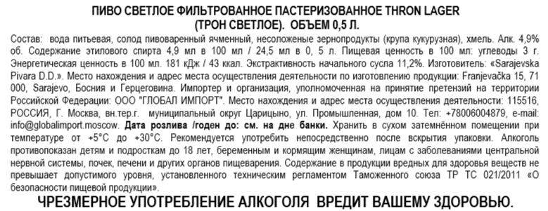 Пиво Thron Lager светлое фильтрованное, 0.5л