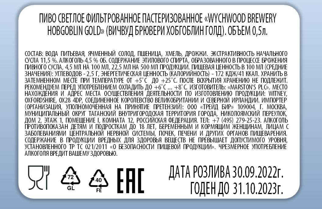 Светлый английский эль, обладающий классическими характеристиками: освежающим ароматом, легкой горчинкой и желто-золотистым цветом. Собственно, и называют его "золотым" (с англ "gold" — золото, золотой), подразумевая при этом не только цвет пива, но и его статус. Как утверждают создатели, согласно легенде, некогда под пивоварней Вичвуд были зарыты сокровища. И пиво "Хобгоблин" Голд — своеобразное напоминание об этом. Пиво сварено из шести сортов хмеля с добавлением пшеницы и ячменного солода, что делает его вкус идеальным, еще раз подчеркивая "золотой статус".