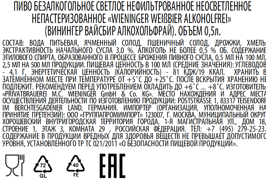 Пиво Wieninger Weissbier Alkoholfrei безалкогольное, 0.5л
