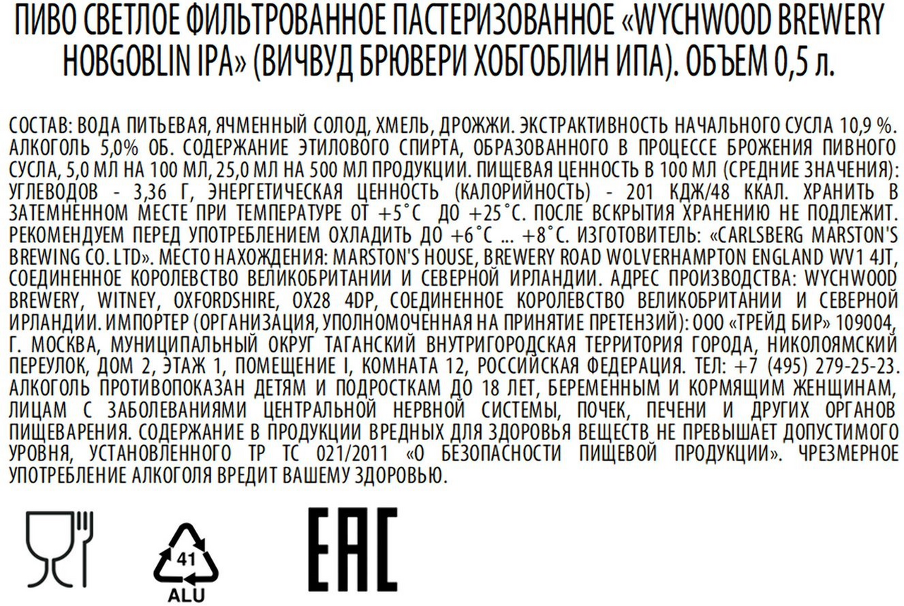 Hobgoblin IPA - изрядно охмелён и наполнен ароматом старого леса вблизи Уитни, оставшись верным традициям серии Hobgoblin. Варится изначально с использованием хмелей Styrian, Golding и Fuggles, а затем усиливается добавлением нескольких мощных американских хмелей. Это столкновение хмелей Старого и Нового Света обеспечивают взрыв тропического аромата и сочную горечь!