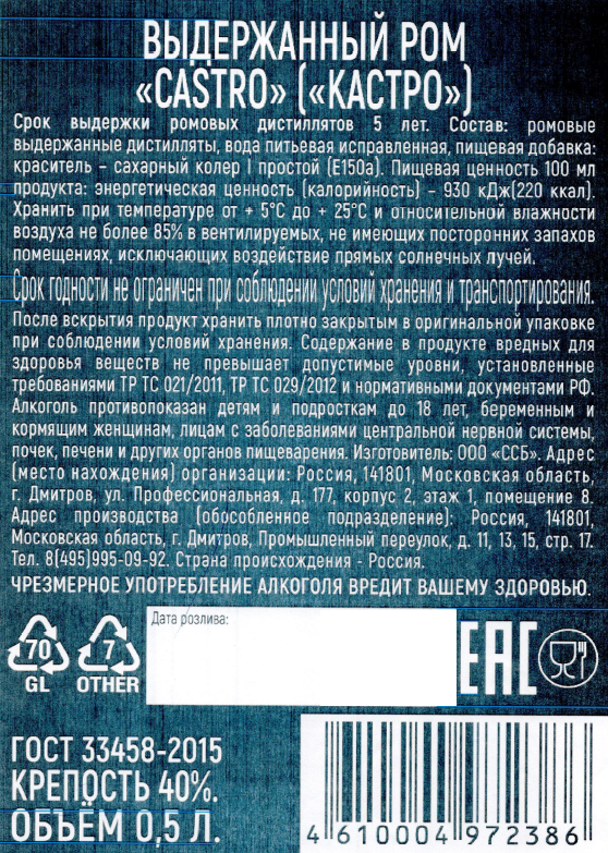 Ром Castro Reserva 5 лет, 0.5л