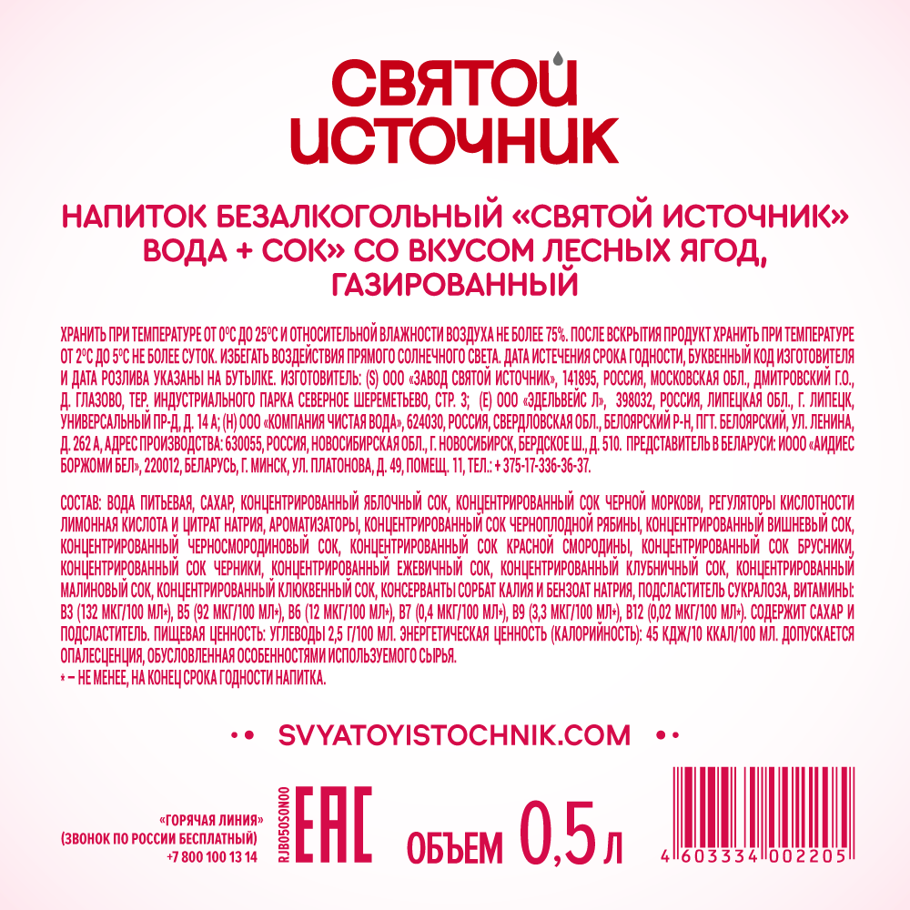 Вода сокосодержащая Святой Источник со вкусом лесных ягод и витаминами газированная, 500мл