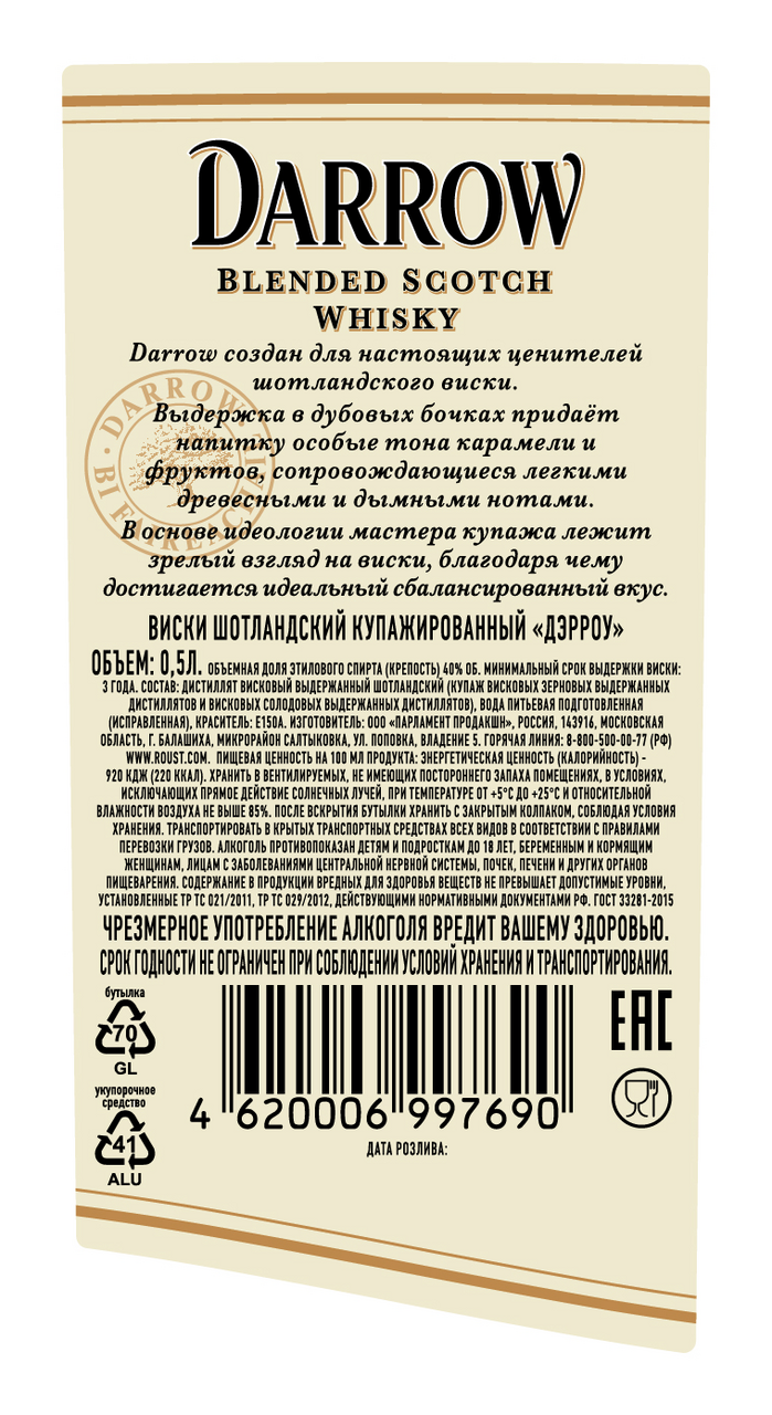 Купажированный шотландский виски, который является собственным брендом компании Руст. Он производится на винокурне Ian Macleod Distillers под чутким руководством мастера купажа, Леонарда Расселла. Название было выбрано не случайно, ведь именно клан Дэрроу на протяжении многих десятилетий отстаивал интересы своей семьи и всей Шотландии. Мужество и бесстрашие являлись основными семейными ценностями Darrow.