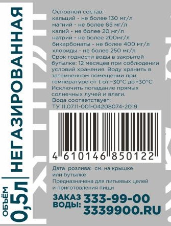Минерализация 50-500 мг/л, общая жесткость не более 7,0 мг/л, кальций не более 130 мг/л, магний не более 65 мг/л.