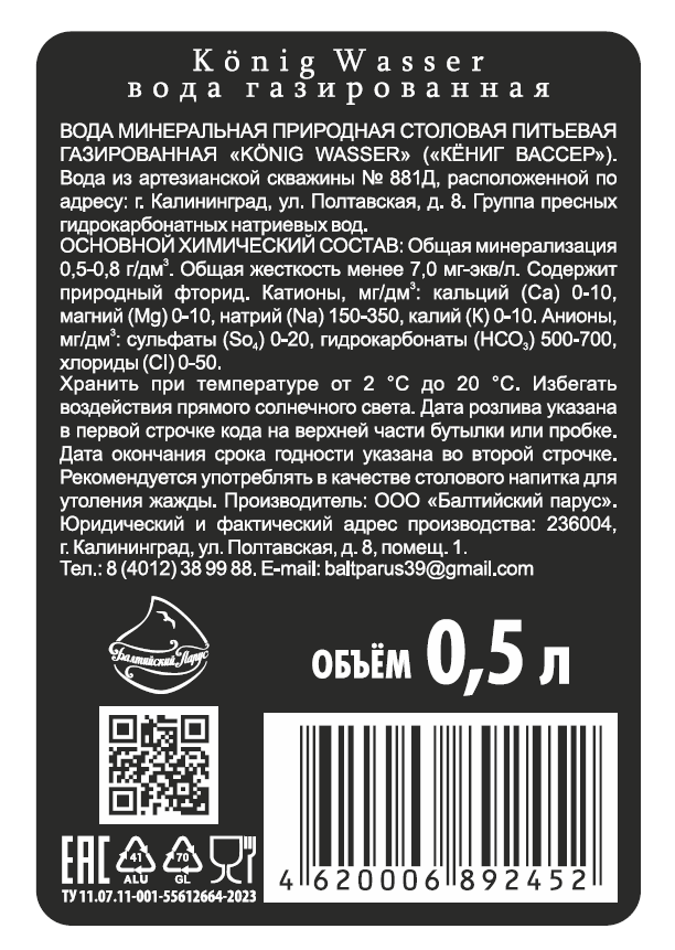 Вода Konig Wasser газированная, 500мл x 12 шт
