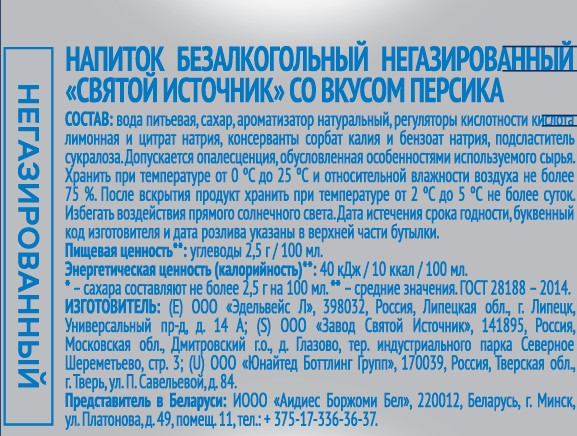 Вода Святой Источник со вкусом персика без газа, 500мл x 12шт - освежающий негазированный лимонад на основе чистой воды из артезианских глубин со вкусом сочного персика. Фруктовое удовольствие – солнечный вкус в небольшой бутылочке, которую удобно можно брать с собой куда угодно. Напиток сочетается с любимыми блюдами и отлично подойдет для ежедневного потребления. Пейте охлажденн��м.