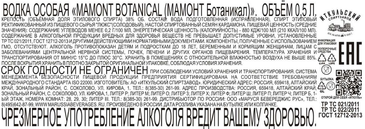 Свежая новинка в линейке бренда Mamont vodka произведена на иткульском спиртзаводе (Алтай). Оригинальный рецепт - настой кардамона и легкий пряный аромат, деликатный и свежий вкус. Подача как в чистом виде, так и в составе коктейлей. В основе рецептуры подготовленная вода и спирт Люкс из солодового сырья, дополненные настоем кардамона. Результат - свежий, кристально чистый вкус с мягкой пряной нотой, напоминающей о северных травах и специях, согревающих даже в самые холодные дни. Фирменная бутылка в форме бивня остается символом силы и духа исследования, а сам напиток приобретает современное звучание благодаря утонченному ботаническому акценту. Лучше всего подавать охлажденной в чистом виде, чтобы раскрыть характерную пряность. Подходит к слабосоленой рыбе, сырам с белой плесенью, легким мясным закускам и коктейлям с цитрусовыми или тоником.