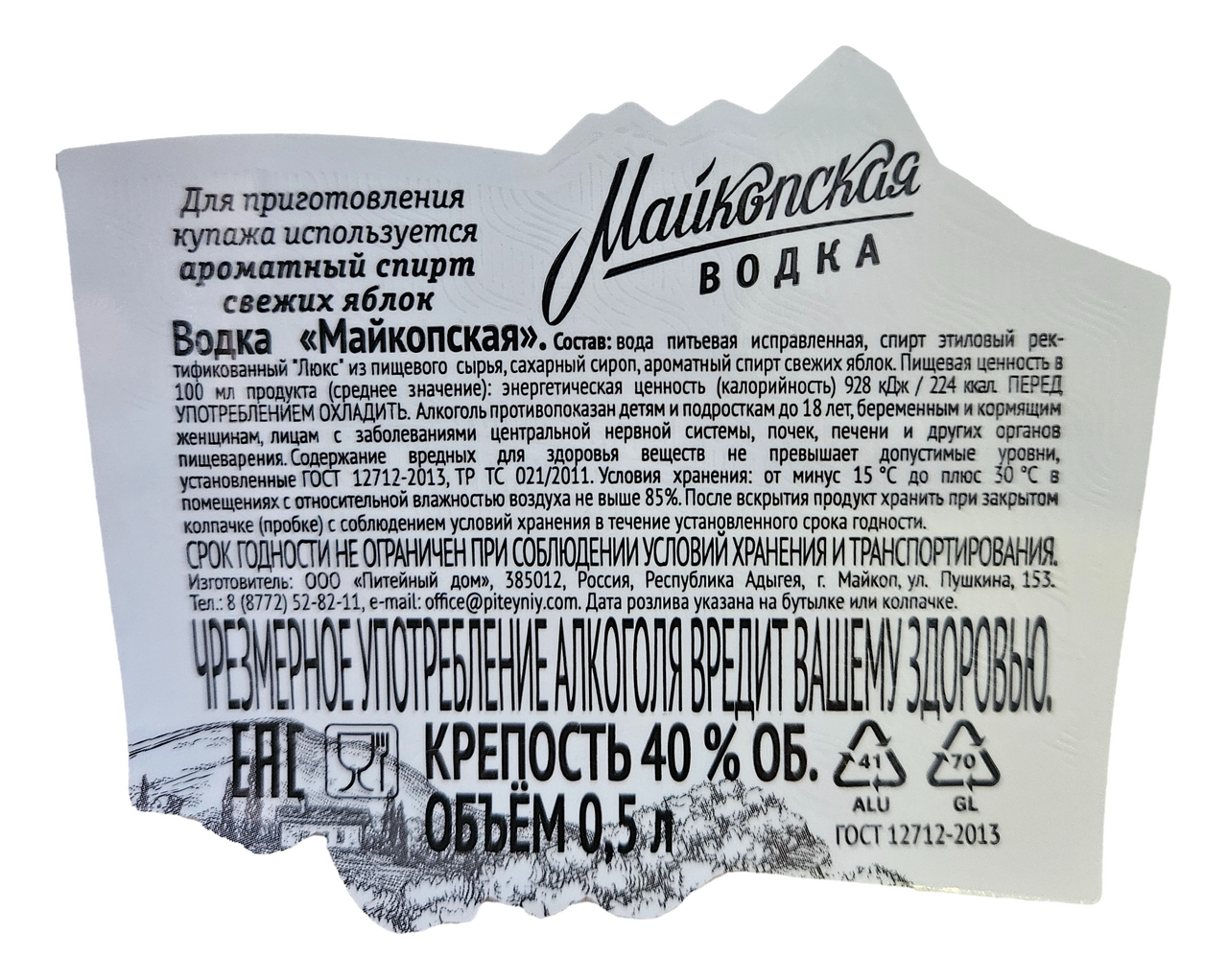 Создается путем купажирования спирта класса Люкс, очищенной воды из водоемов Адыгеи и настоя яблок. Данная марка известна и любима в России уже несколько десятилетий, еще со времен Советского Союза. Водка хорошо сочетается с острыми блюдами, мясом, рыбой, сельдью, соленьями и первыми блюдами.