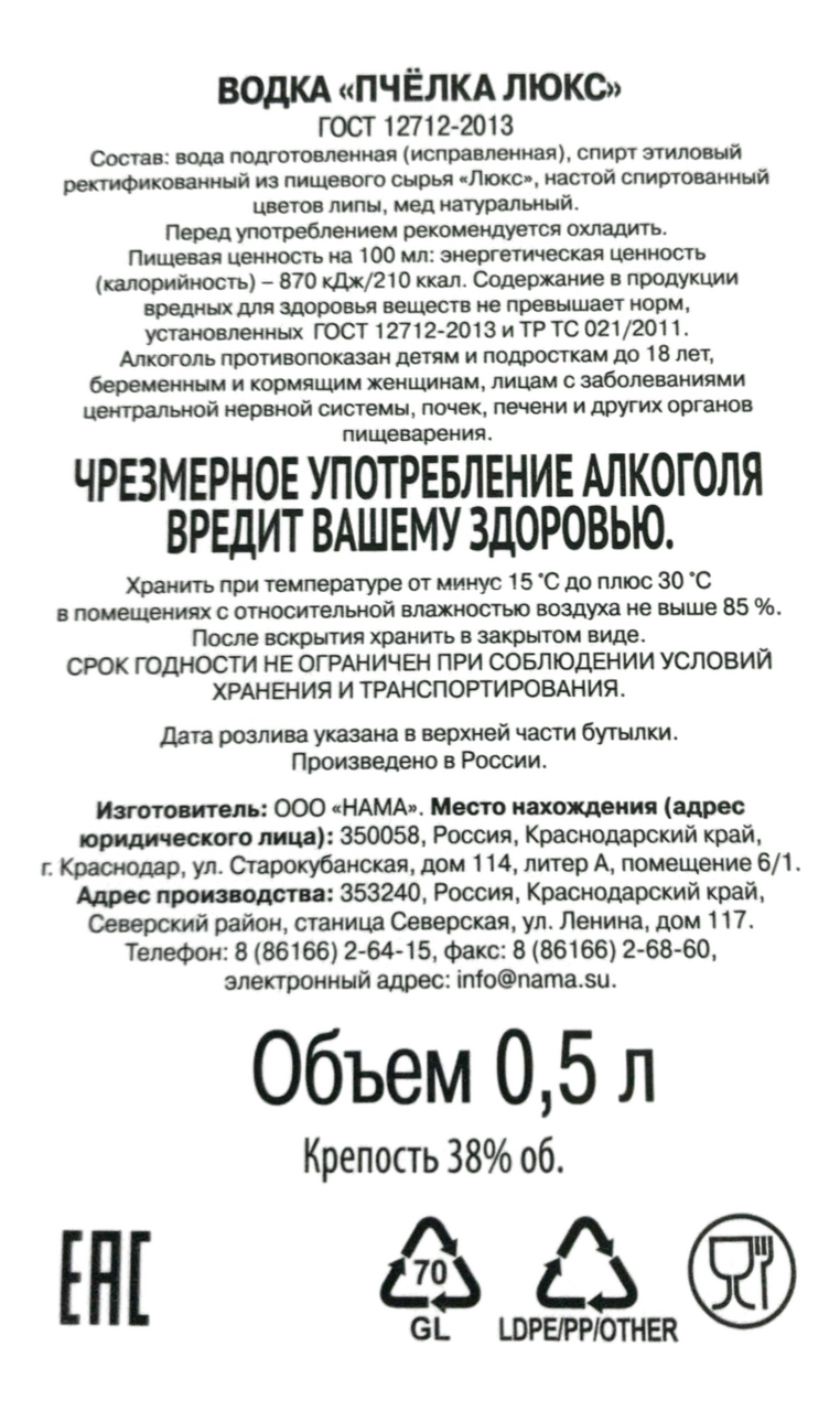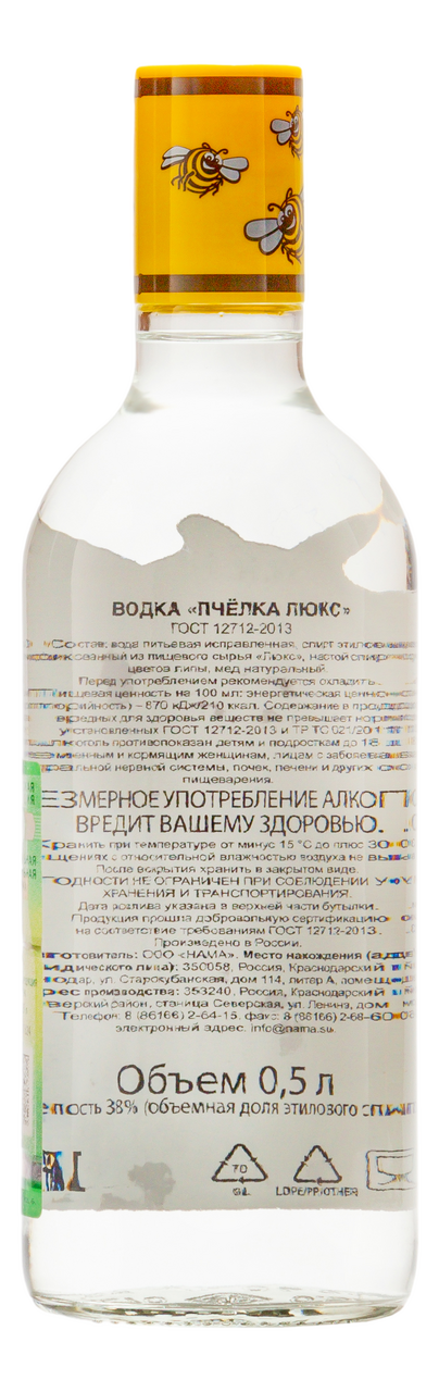 Классическая водка, изготовленная исключительно из натуральных ингредиентов: воды из собственной артезианской скважины глубиной 600 метров, спирта класса Люкс, спиртованного настоя липового цвета и меда. Водка обладает мягким, сладковатым вкусом. Этикетка водки украшена изображением симпатичной пчелки, что полностью соответствует концепции бренда.