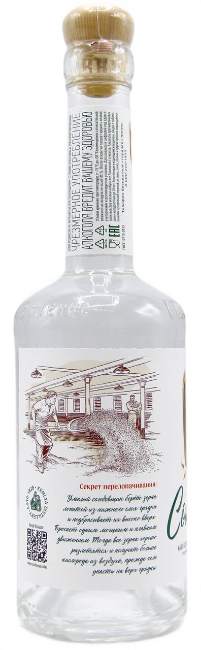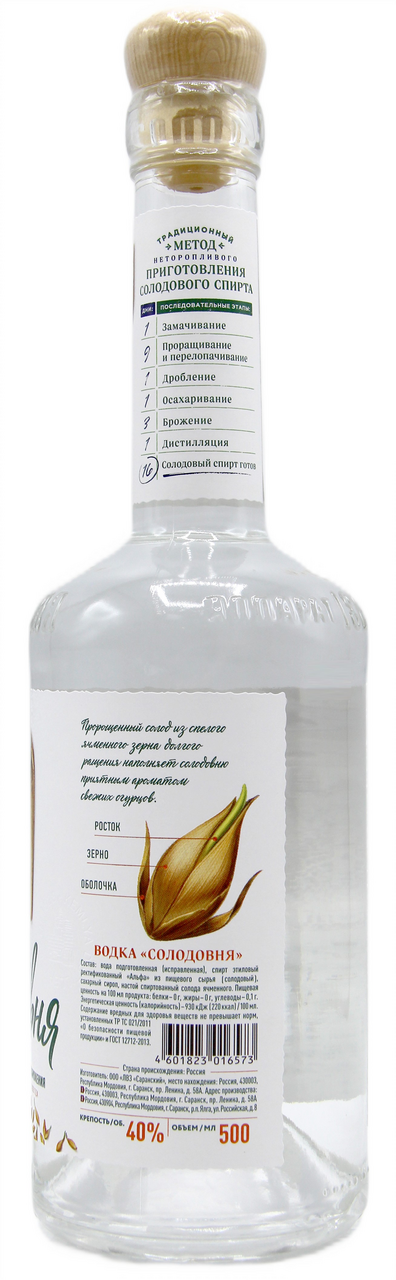 Водка Солодовня - каноническая водка превосходного качества. Традиционный метод неторопливого приготовления солодового спирта. Классическая водка с настоем ржаного солода, обладающая ярким ароматом и мягким вкусом с тонами свежеиспеченного хлеба. Водка изготавливается из спирта класса Альфа естественного солодового брожения, созданного по старинному методу, разработанному немецким инженером Г. Генце в 1873 году. Он заключается в цельном разваривании зерна острым паром при температуре 150 градусов Цельсия и при высоком давлении в 5 атмосфер. Последующая дистилляция проходит в традиционных медных кубах, затем следует длительная выдержка в доводных чанах. Водка Солодовая ярмарка разливается в эксклюзивную бутылку с оригинальной пробкой камю и благородным дизайном этикетки.