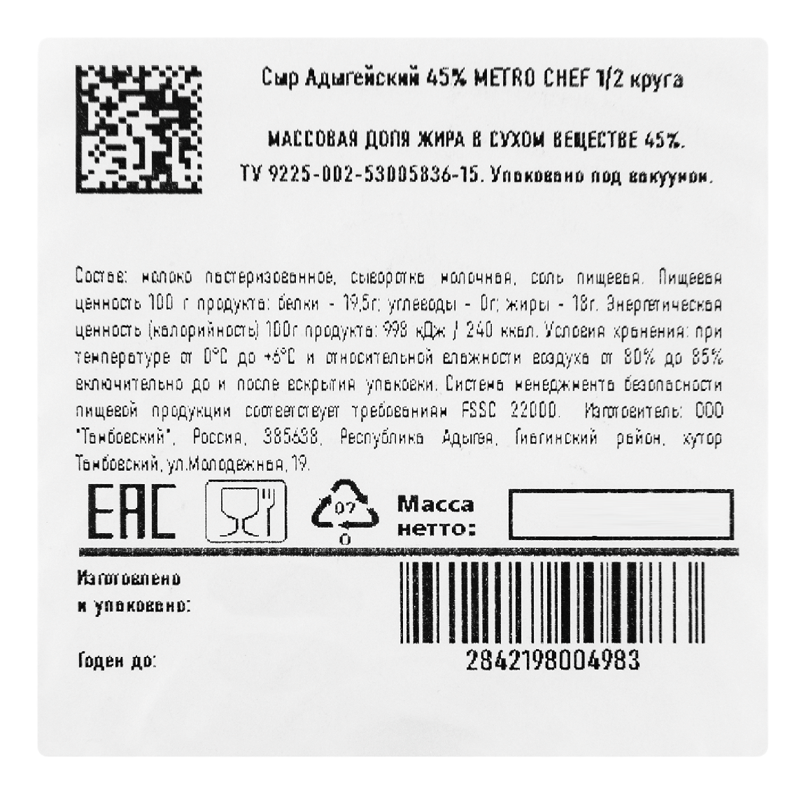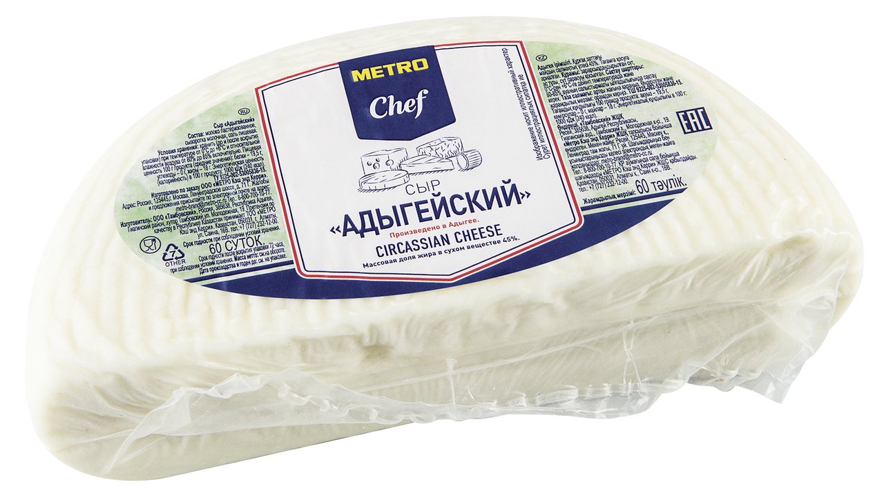 Metro Chef Сыр адыгейский 45%, ~650г представляет собой мягкий кисломолочный продукт с нежной консистенцией. Сыр считается диетическим благодаря невысокому содержанию жиров, а также низкой калорийности. Богатый источник белка и кальция благоприятно влияет на костную и мышечную системы организма. В нем также содержится достаточное количество минералов и витаминов А, В, С, которые укрепляют и повышают иммунитет. Адыгейский сыр используют в качестве начинок для выпечки (пирогов и пирожков), сочетают со свежими фруктами, ягодами и овощами, готовят салаты и холодные закуски, иногда добавляют в пиццу. Также из продукта можно приготовить некоторые блюда восточной национальной кухни: ленивую ачму, кутабы, осетинский пирог, хачапури по-абхазски, хычины с сыром.