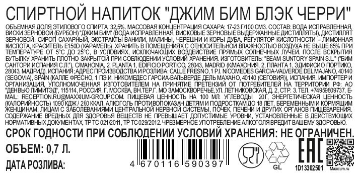 Вода подготовленная, виски бурбон Джим Бим вода подготовленная, зерновой дистиллят кукуруза, рожь, ячменный солод, дистиллят висковый зерновой, сироп сахарный, экстракт черешни, экстракт ванили, ароматизаторы Малина, Дуб, краситель - сахарный колер I простой карамель, регулятор кислотности - лимонная кислота.