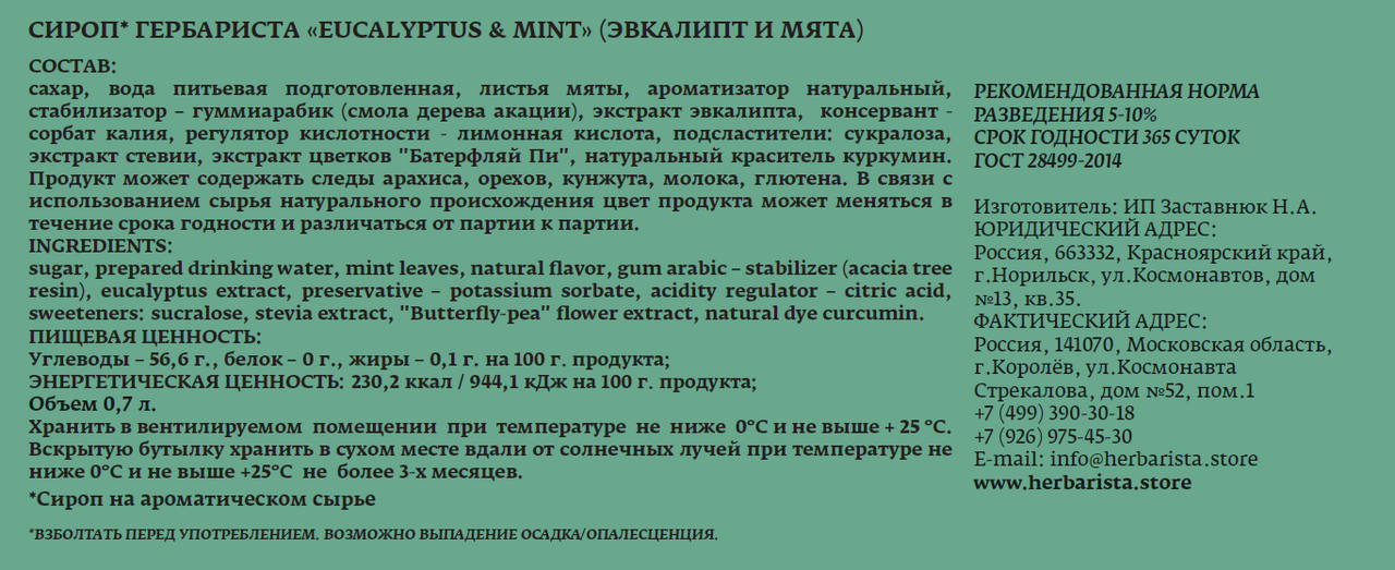 Сироп Herbarista мята-эвкалипт, 700мл x 6 шт