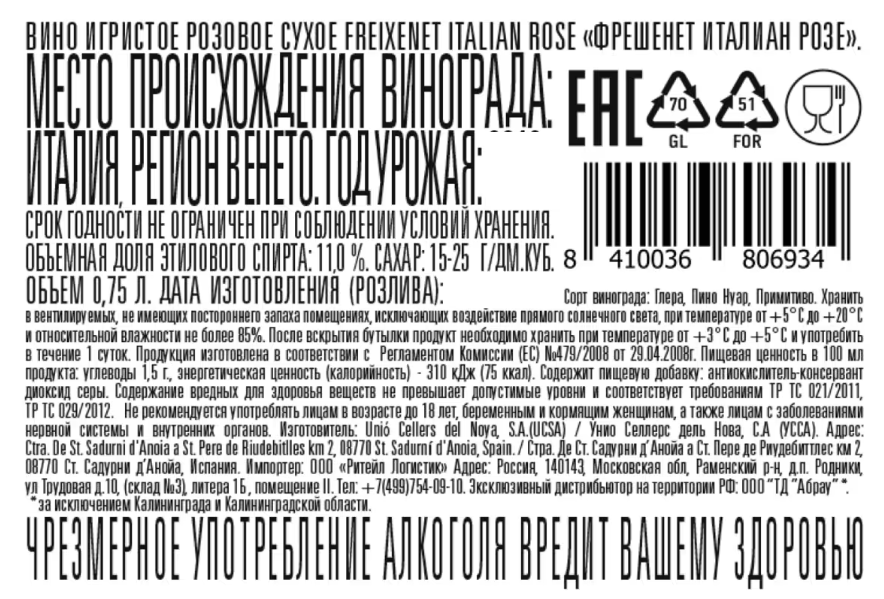 Вино игристое Freixenet Italian Rose розовое сухое, 0.75л