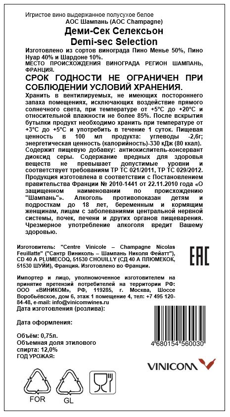 Шампанское Nicolas Feuillatte Reserve Exclusive Brut белое брют в подарочной упаковке, 0.75л — роскошное, изысканное шампанское, созданное из купажа трех сортов винограда — Пино Нуар, Пино Менье и Шардоне. Ягоды произрастают на 150 виноградниках аппелласьна Шампань. Сбор урожая проводится исключительно вручную, на винодельне плоды подвергаются мягкому прессованию с последующей ферментацией в стальных резервуарах. Каждый сорт винограда ферментируется отдельно. В вино добавляется 15-30% резервного вина. После бутилирования в шампанское добавляют тиражный ликер, благодаря которому начинается вторичная ферментация. Выдержка шампанского длится 2 года. Шампанский Дом Николя Фейят, основанный в 1976 году, за короткое время успел не только обогнать многих именитых производителей с многовековой историей, но и занять место в пятерке крупнейших Домов Шампани. В 1986 году компания заключила союз с объединением элитных виноградников "Сентре Виниколе де ла Шампань" с целью продвижения шампанского Nicolas Feuillatte. Сегодня Шампанский Дом объединяет более тысячи виноградарей и 86 винодельческих хозяйств. Совместные владения охватывают территорию в 2 тысячи гектаров виноградников, что составляет 7% территории аппеласьона Шампань. Шампанское под лейблом "Nicolas Feuillatte" производится из винограда, выращенного на 10 виноградниках категории Гран Крю и 27 виноградниках Премье Крю в различных регионах Монтань де Реймс, Кот де Блан, Л`Ардре, Весль, Сезанне, в долине Марна. Успешность в получении великолепного шампанского зависит от качества используемых дрожжей, поэтому Шампанский Дом Nicolas Feuillatte вывел собственную дрожжевую культуру в своей лаборатории. Ежегодные продажи Дома Nicolas Feuillatte составляют около 7 миллионов бутылок в год, 50% из которых экспортируется в более чем 50 стран мира, в том числе в Австралию, Великобританию, США, Италию, Германию и Россию.