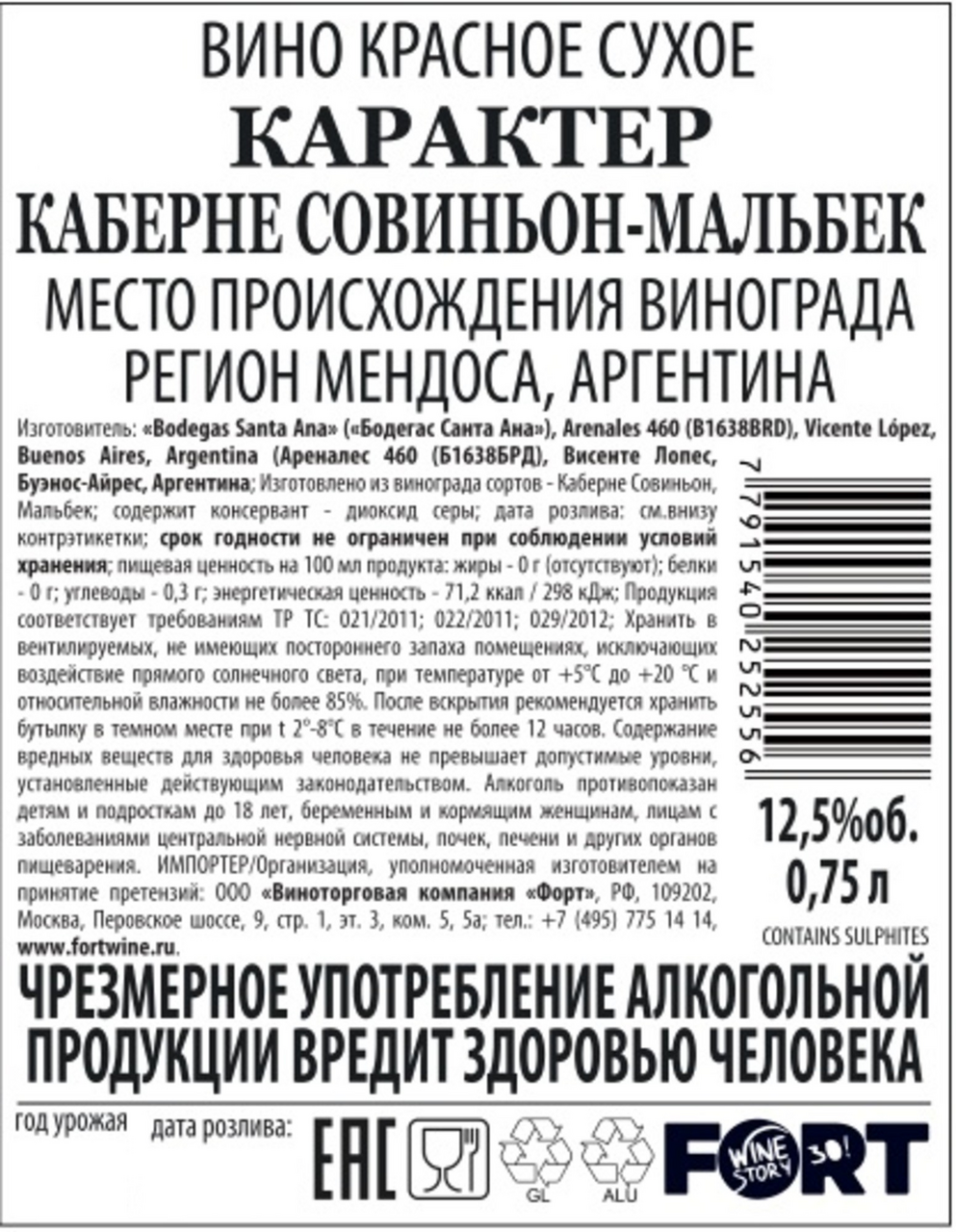 Виноград сортов: Мальбек 50%, Каберне Совиньон 50%, антиокислитель - диоксид серы (Е220).